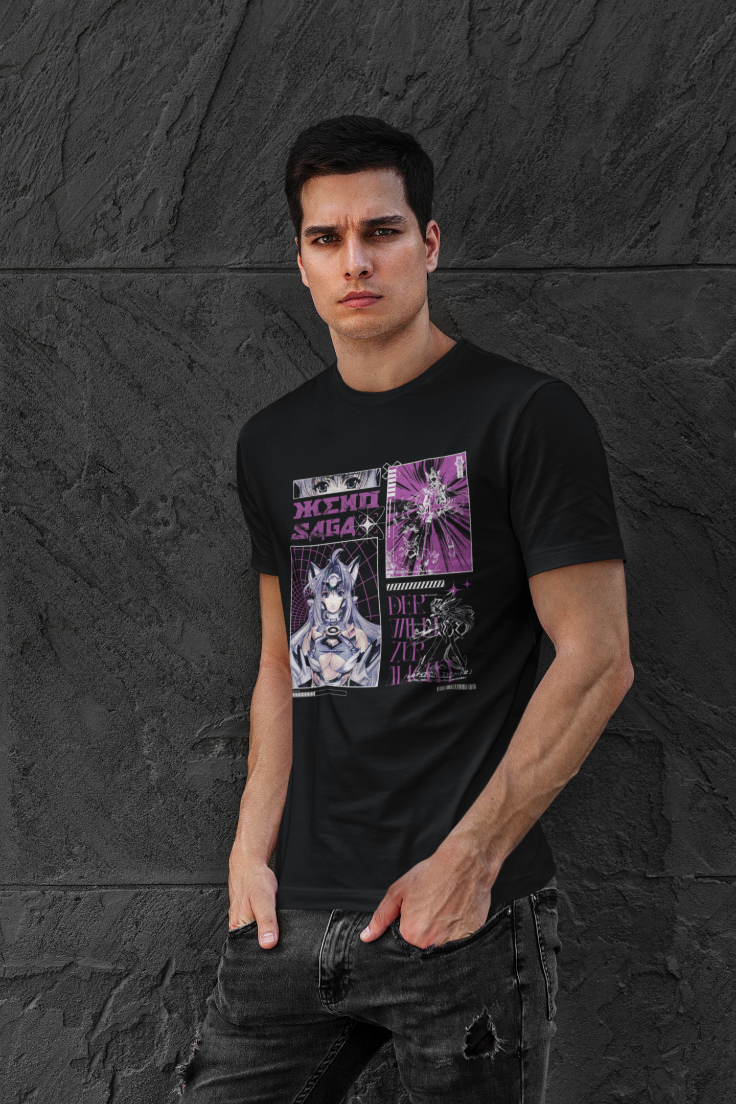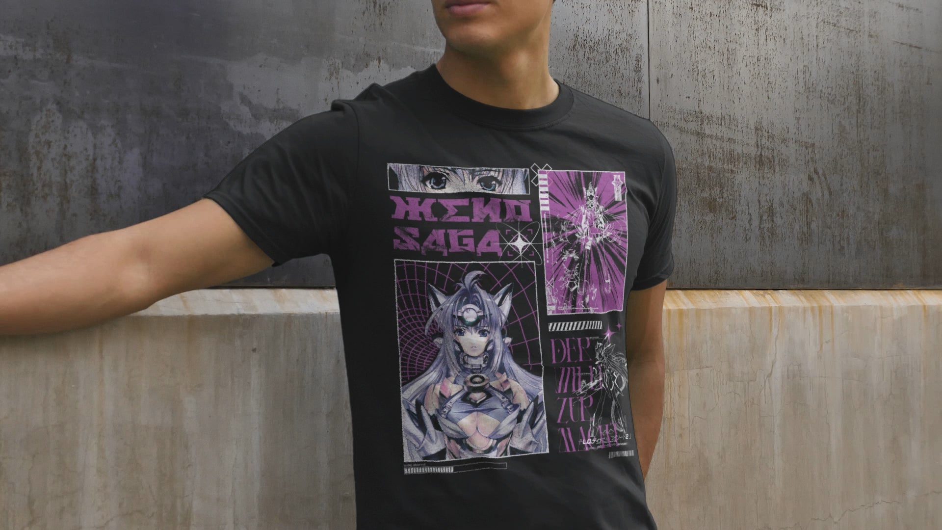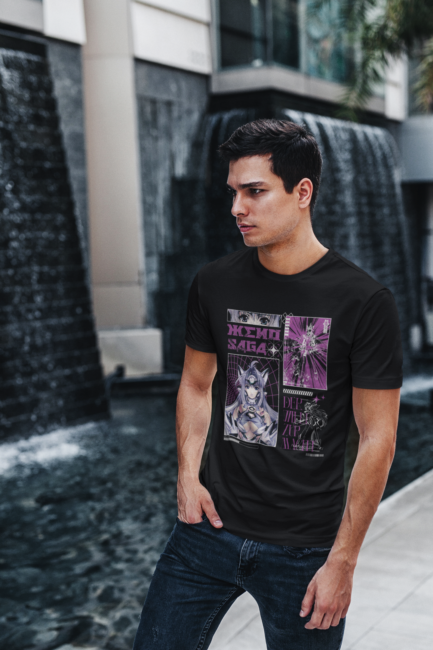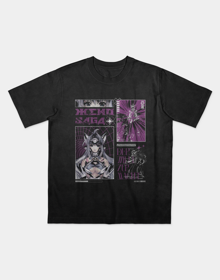 A brutalist vision of deep space, AI consciousness, and cosmic destiny—this design brings the legendary Xenosaga aesthetic to life. Featuring a glitchy, cyber-gothic composition with KOS-MOS at its core, this tee is perfect for those who embrace the void of the unknown.