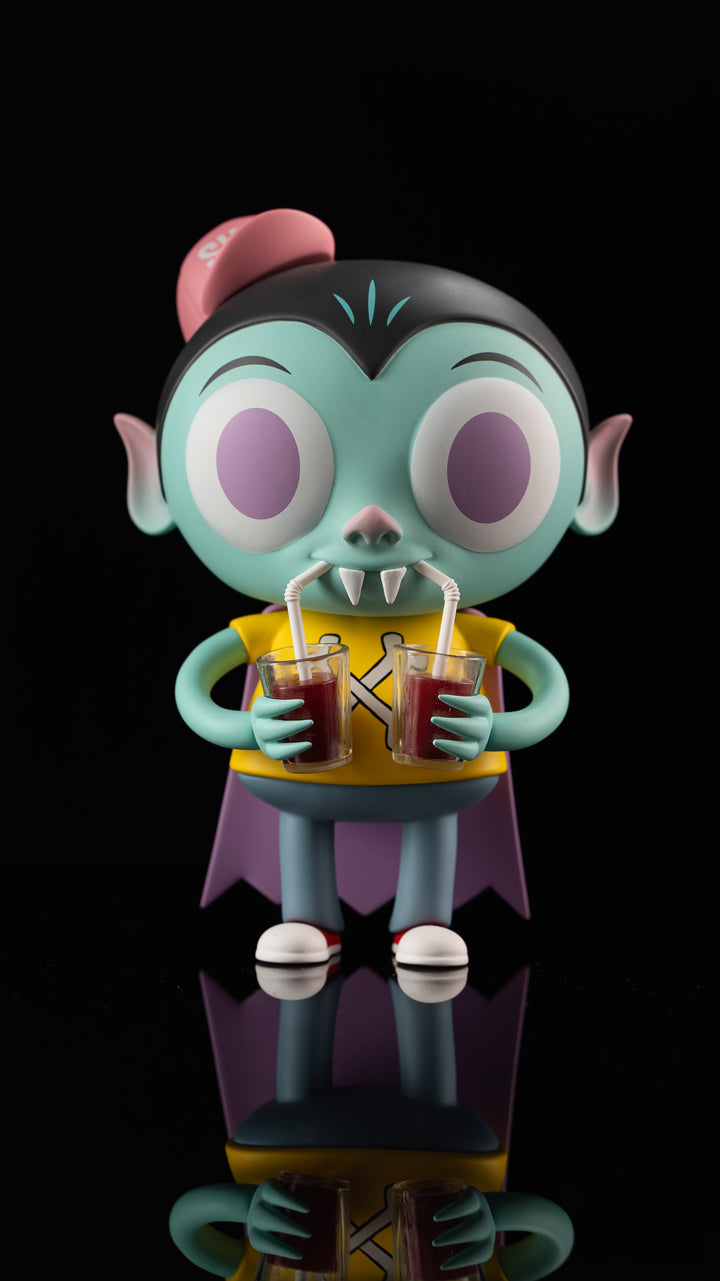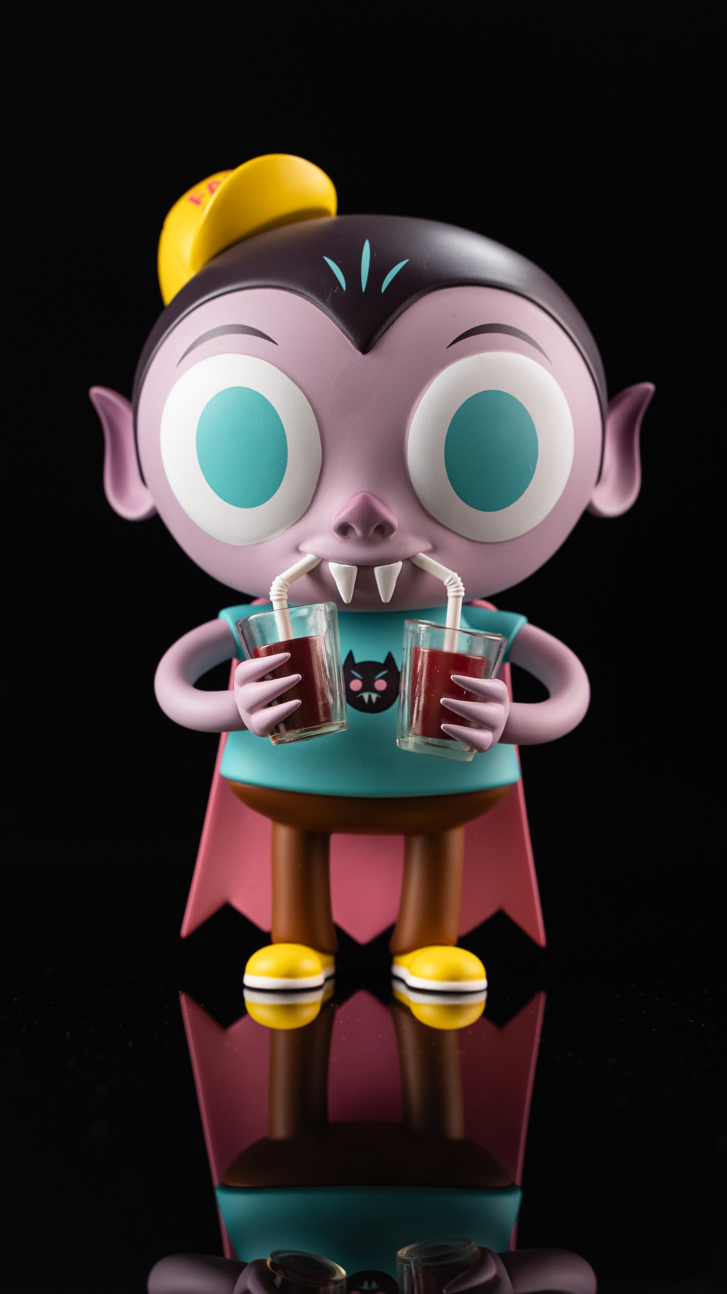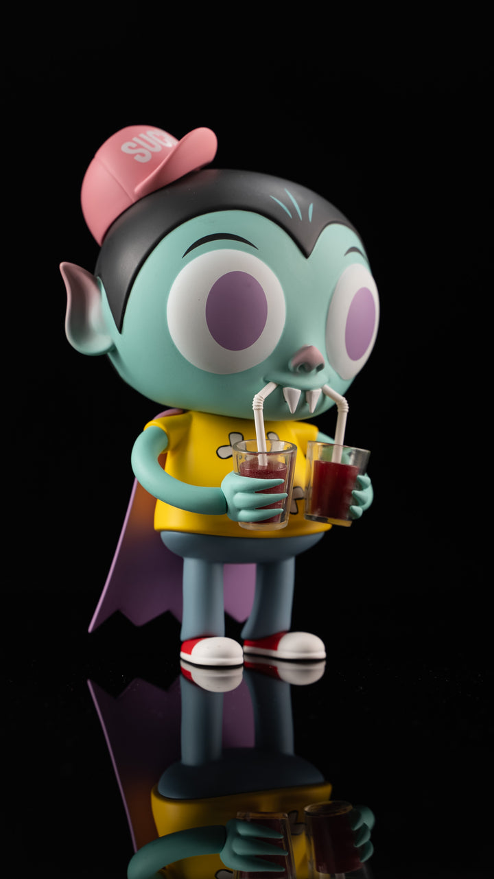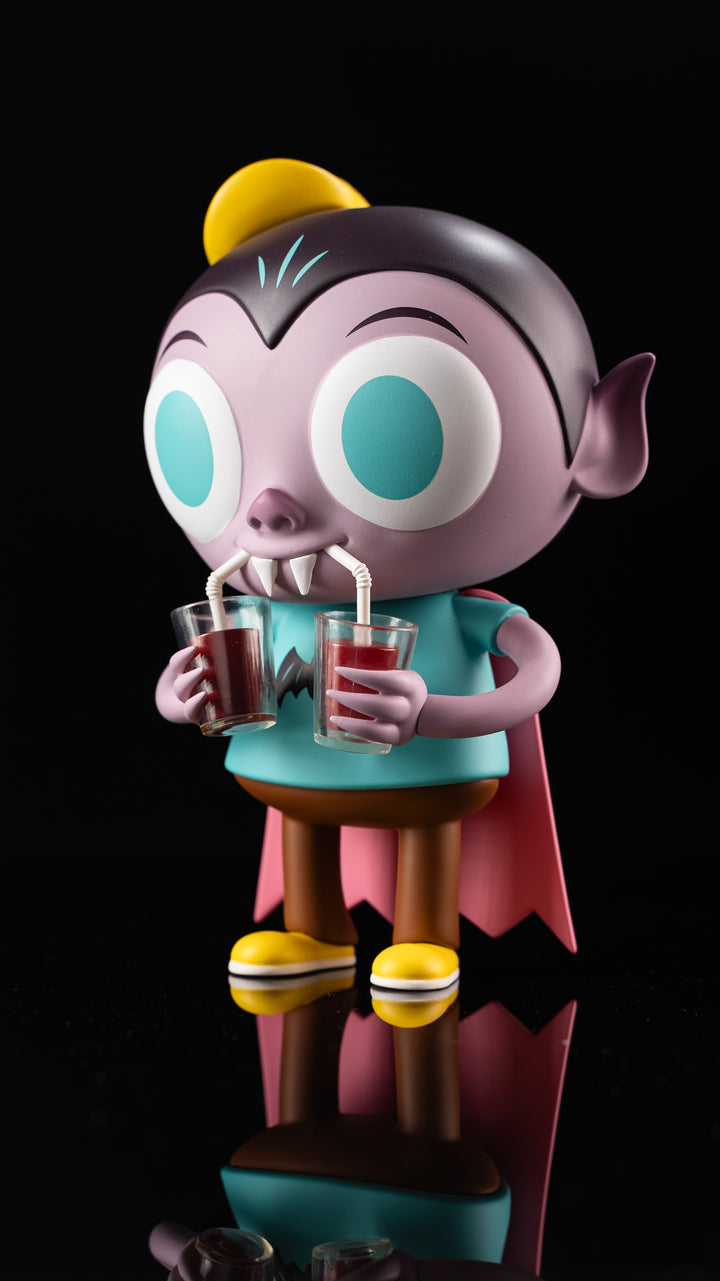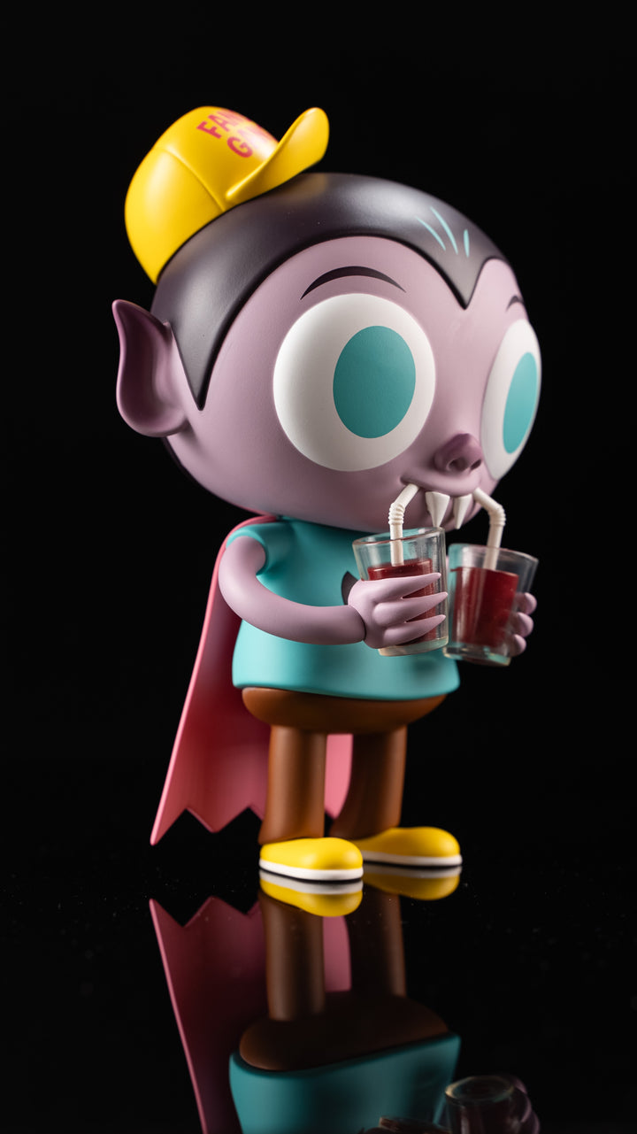 Kid Kuagula features a stake in his back, double blood drinks, and a magnetic hat.