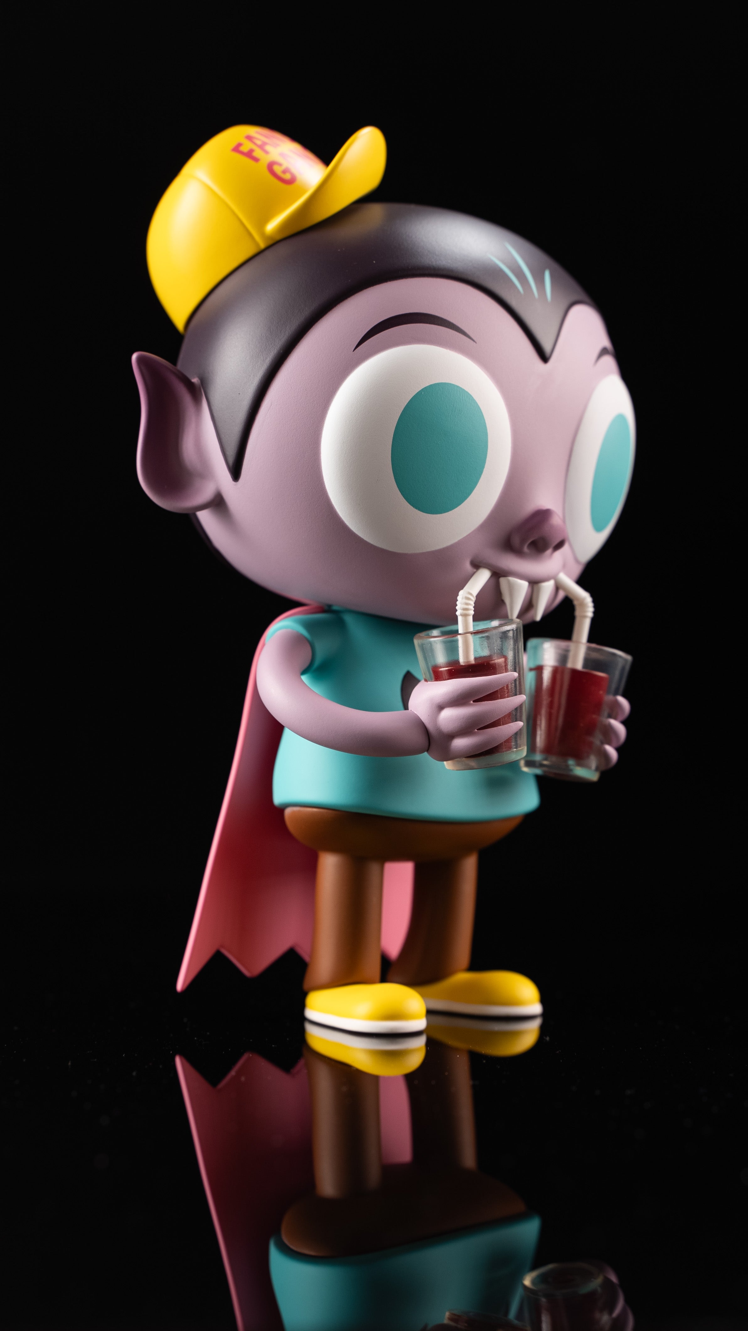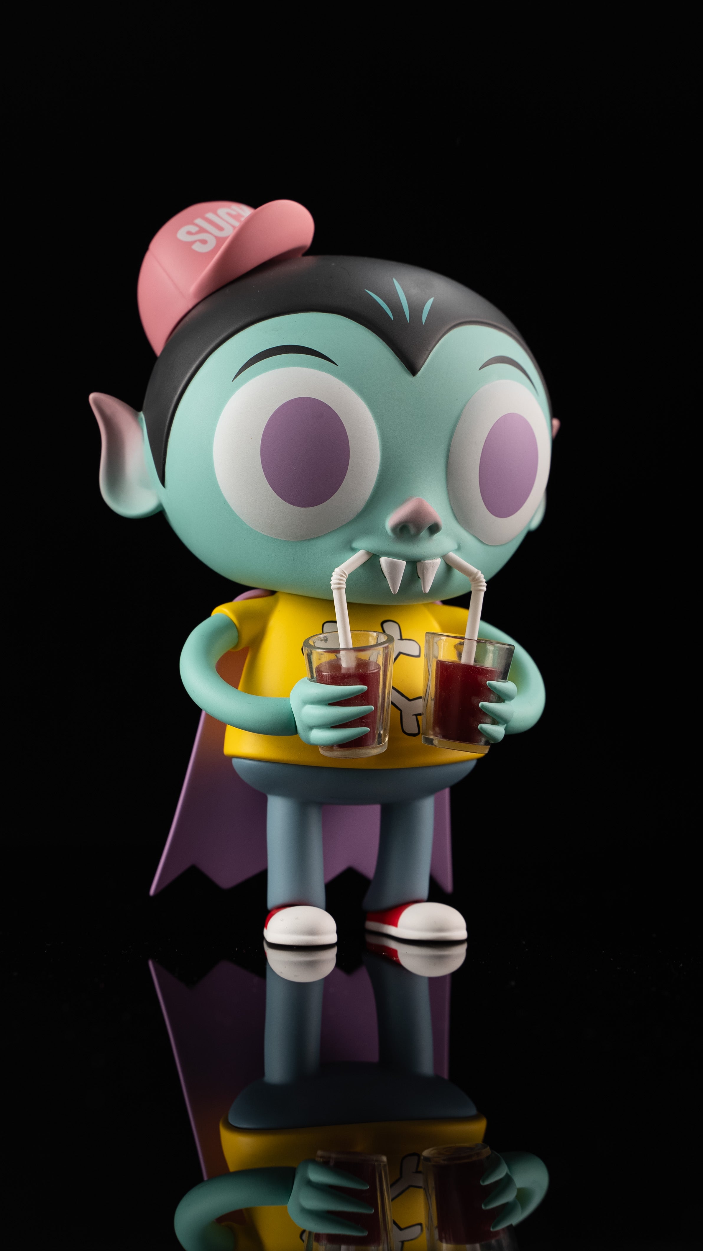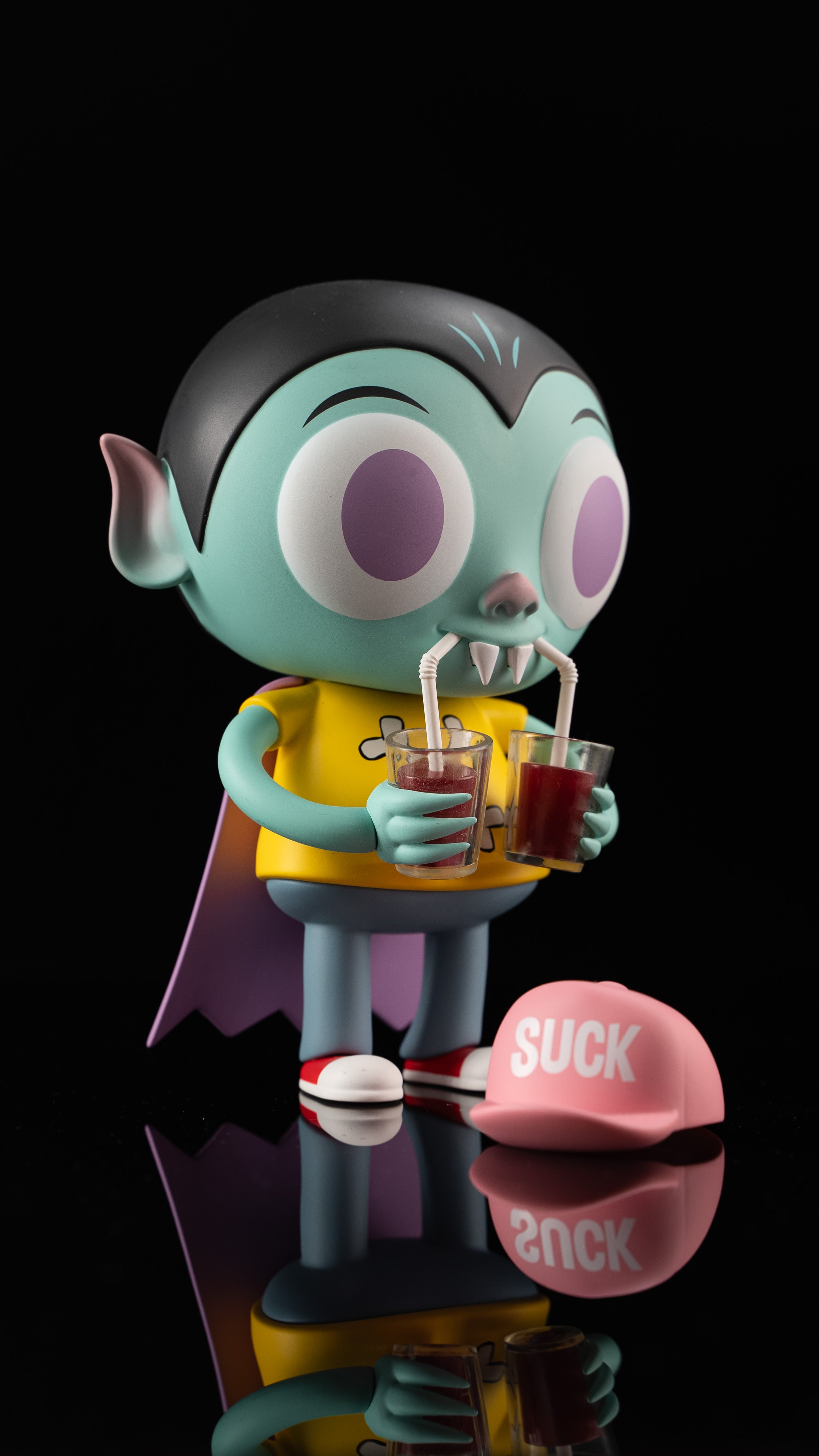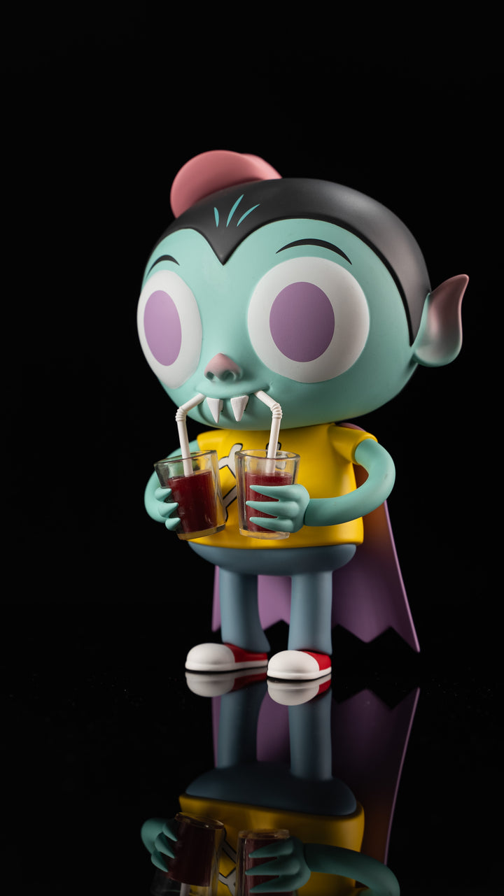 Kid Kuagula features a stake in his back, double blood drinks, and a magnetic hat.