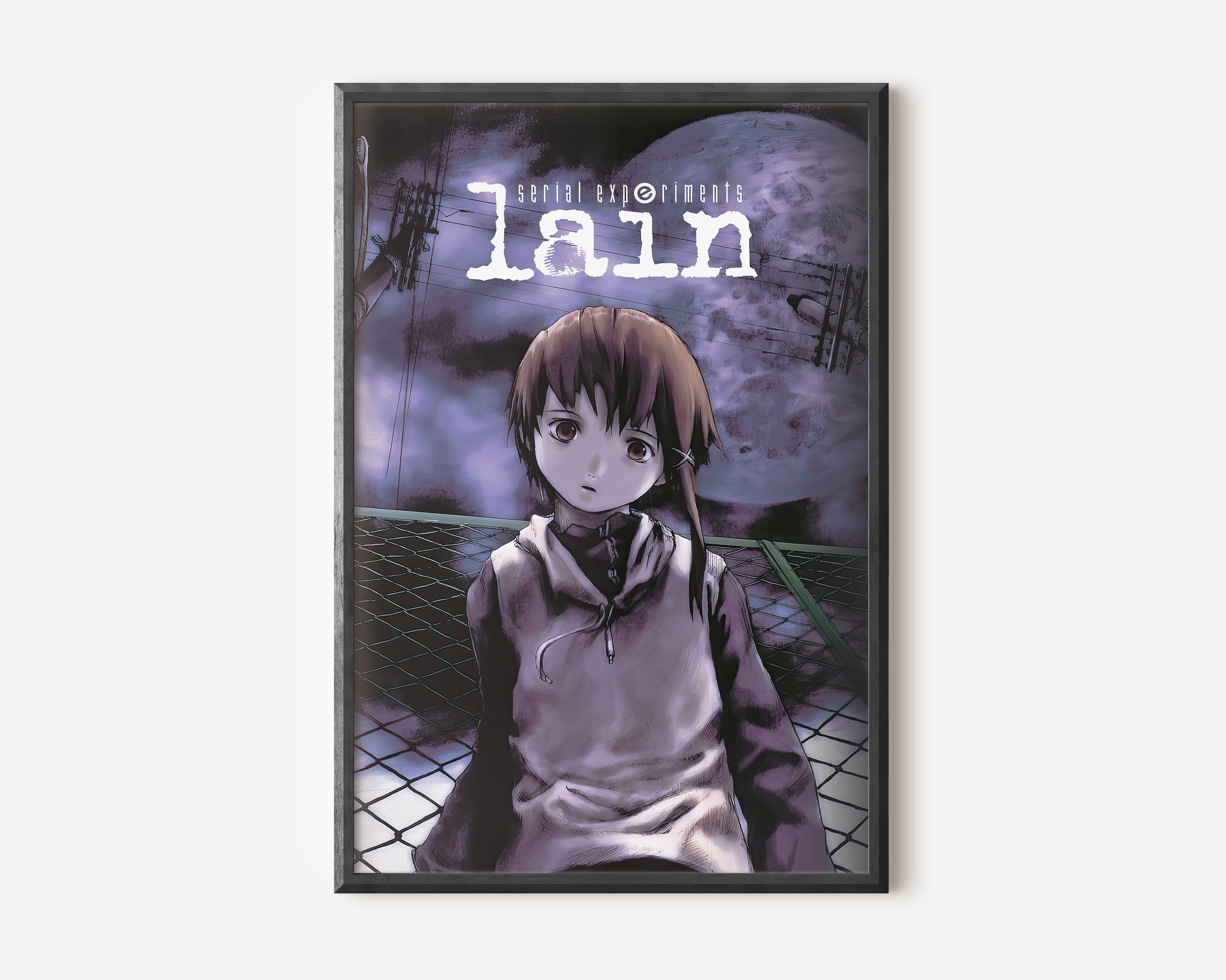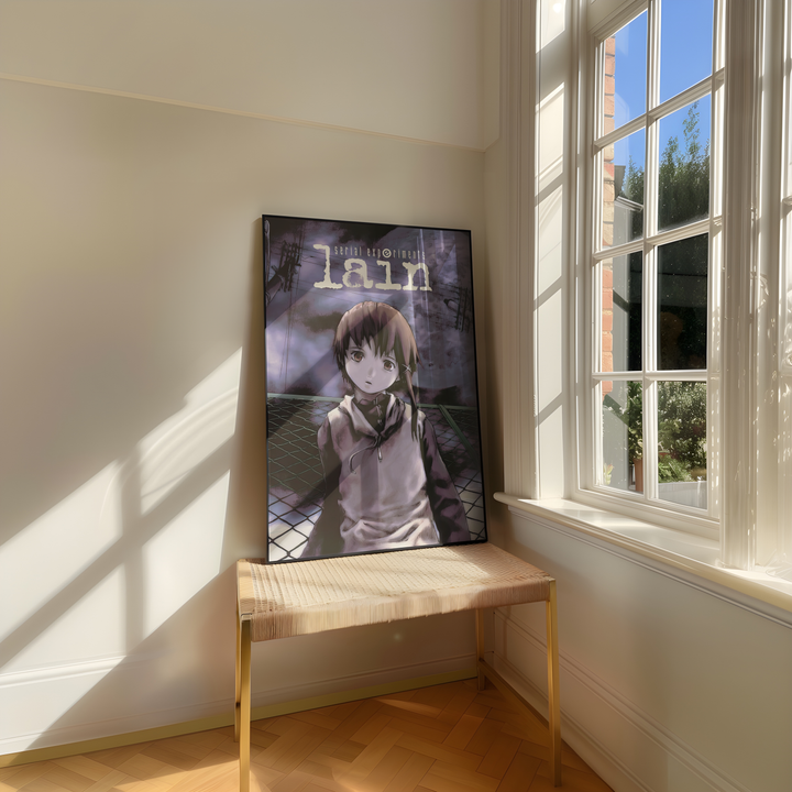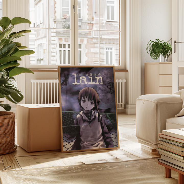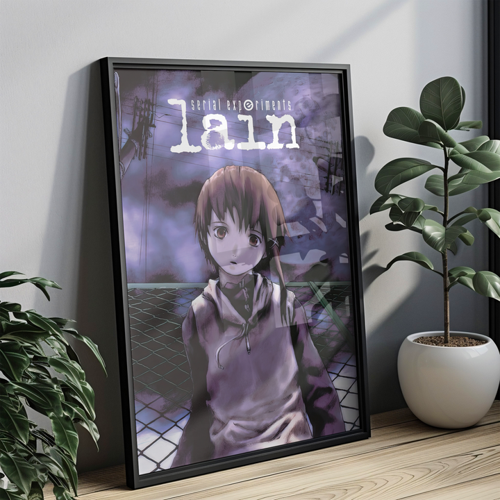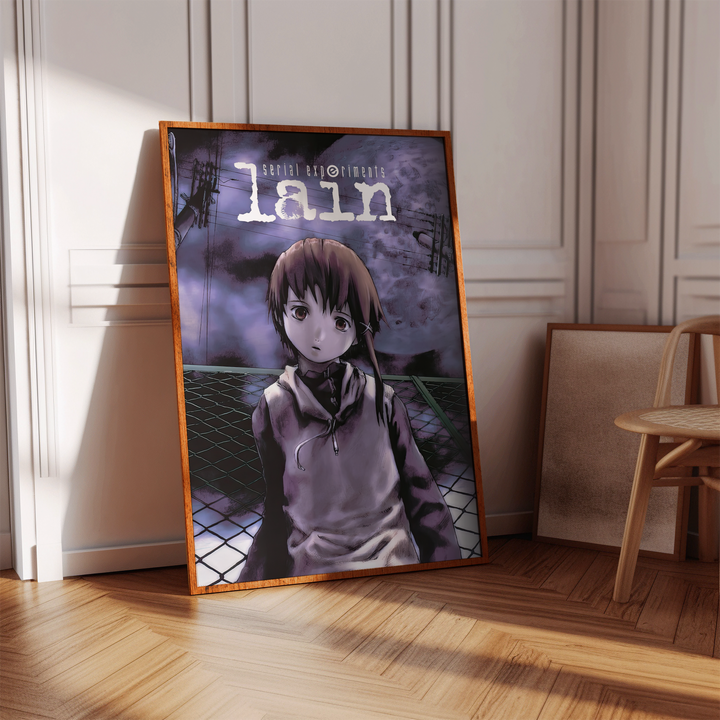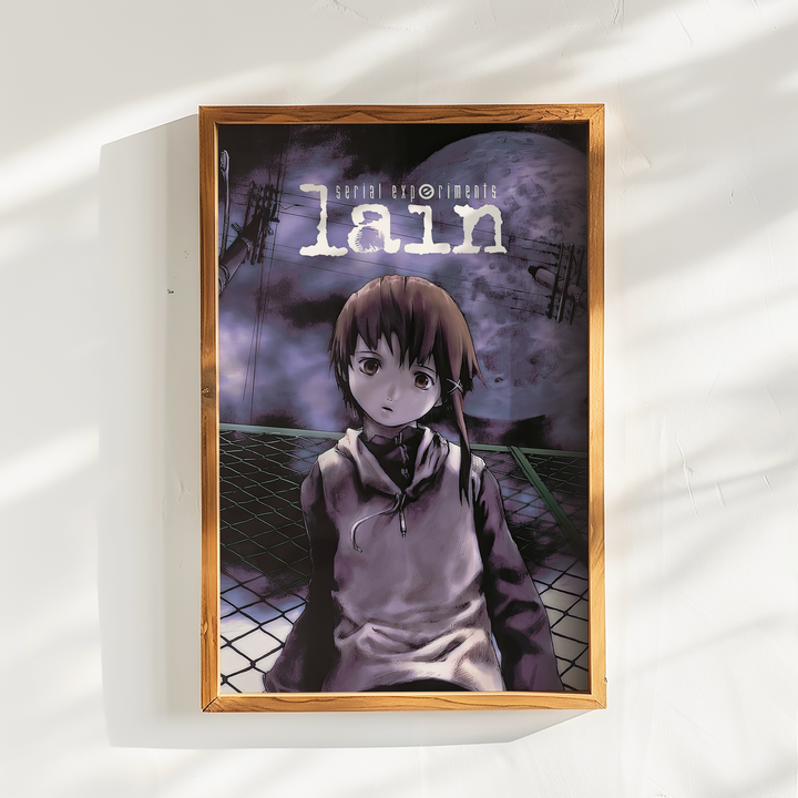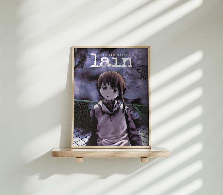 Step into the unsettling digital dreamscape of Serial Experiments Lain with this hauntingly atmospheric poster, featuring Lain Iwakura against an eerie, glitch-ridden backdrop. With its deep purple hues, surreal cyberpunk aesthetic, and existential undertones, this print perfectly captures the mystery, isolation, and digital paranoia of the iconic psychological thriller.