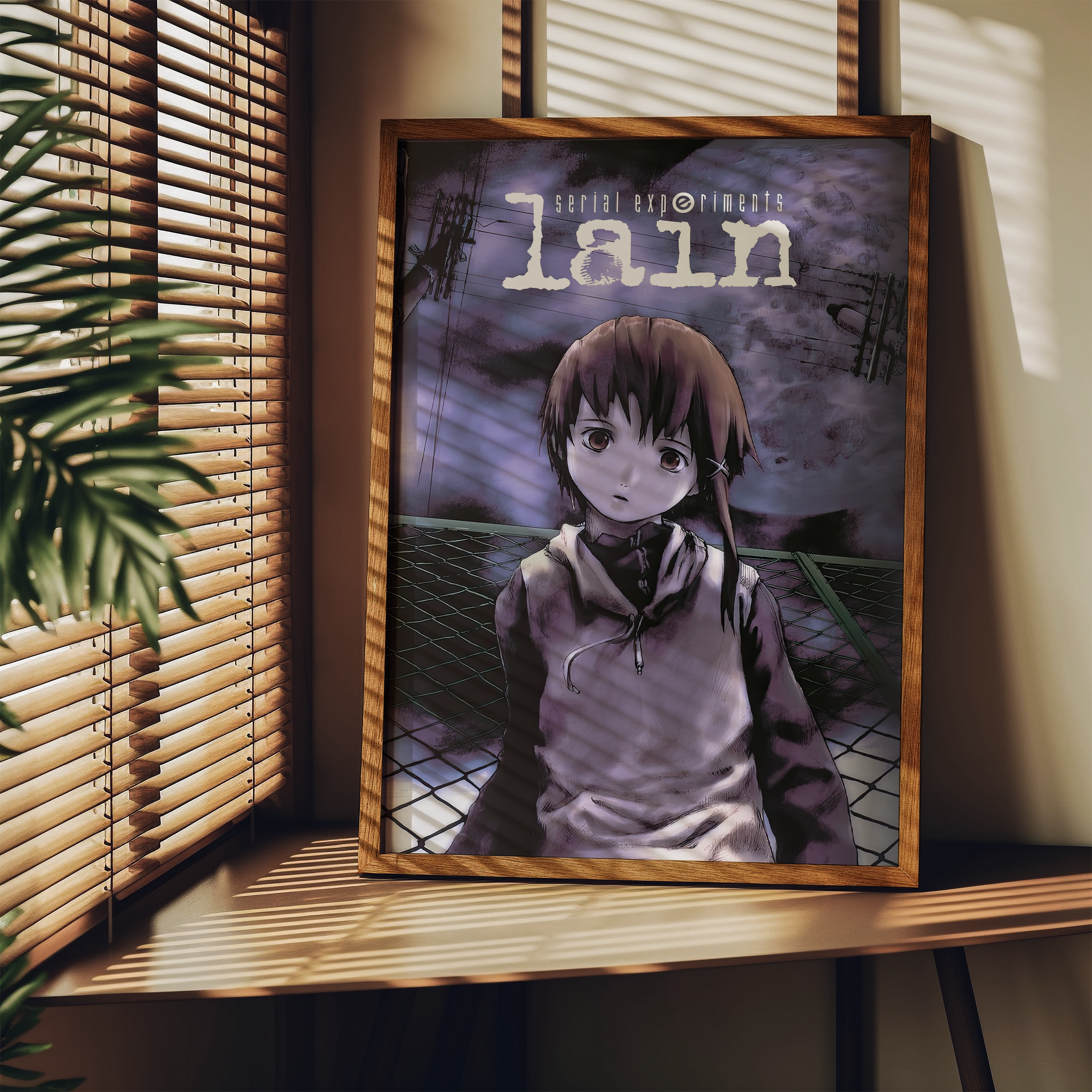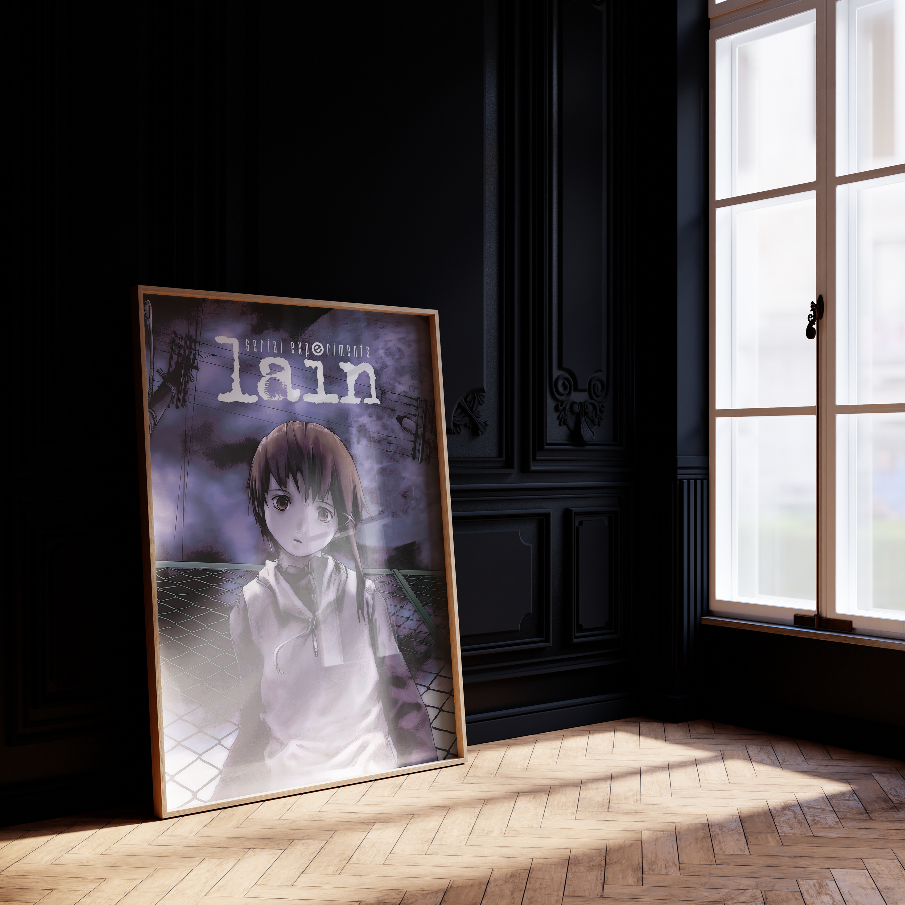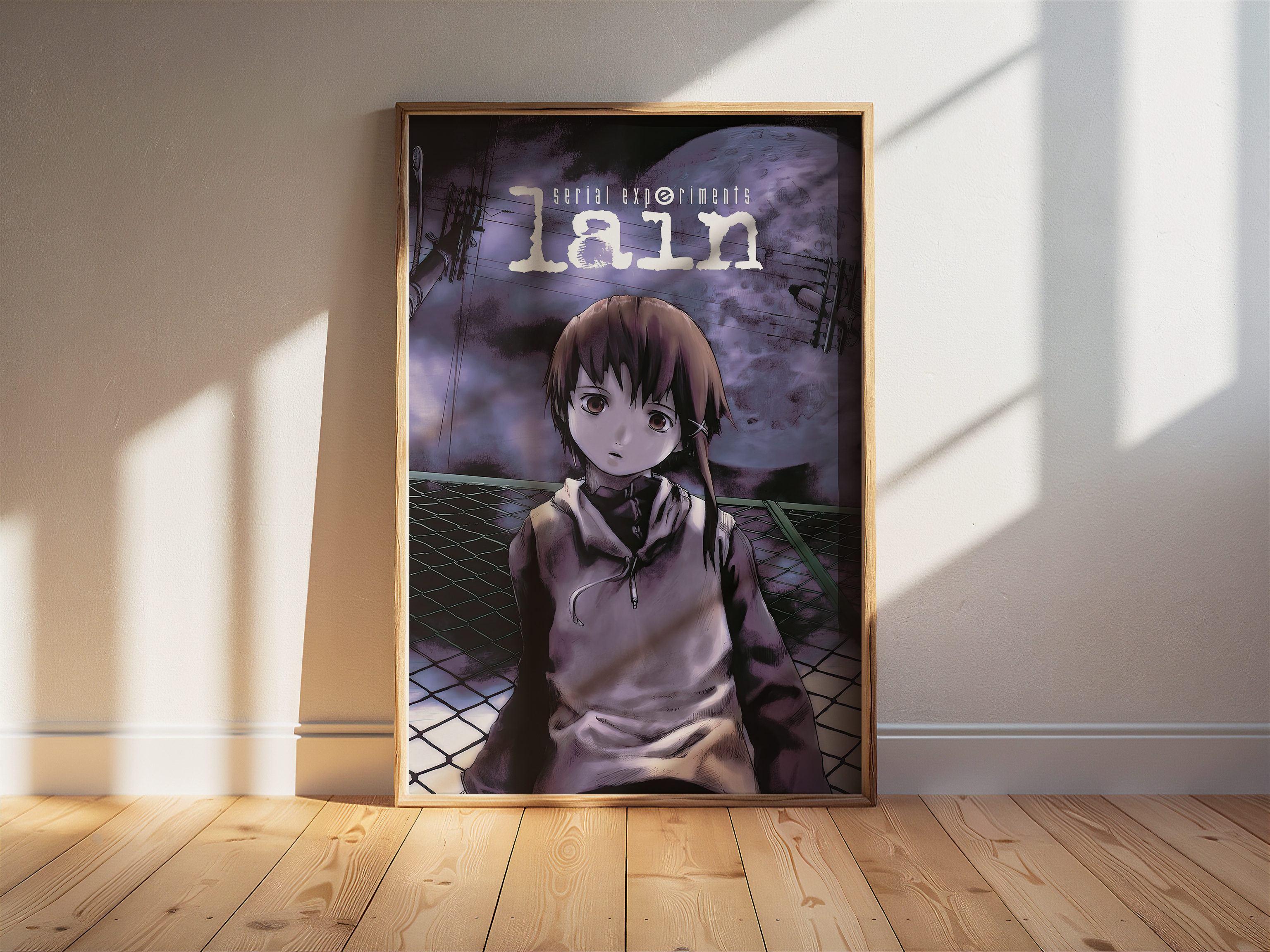 Step into the unsettling digital dreamscape of Serial Experiments Lain with this hauntingly atmospheric poster, featuring Lain Iwakura against an eerie, glitch-ridden backdrop. With its deep purple hues, surreal cyberpunk aesthetic, and existential undertones, this print perfectly captures the mystery, isolation, and digital paranoia of the iconic psychological thriller.