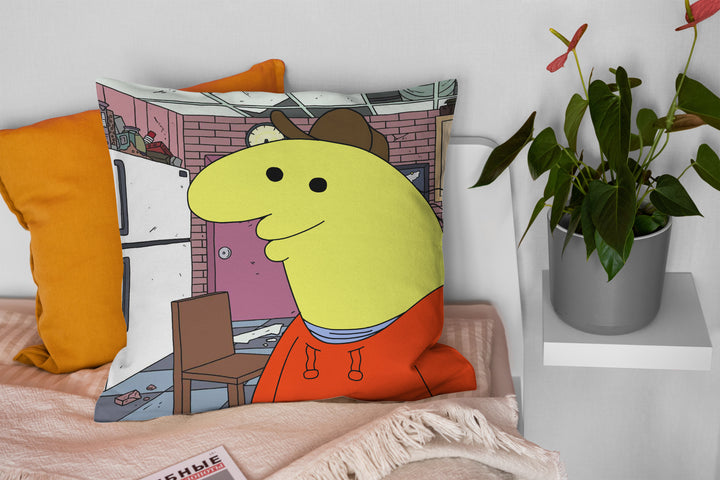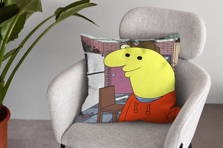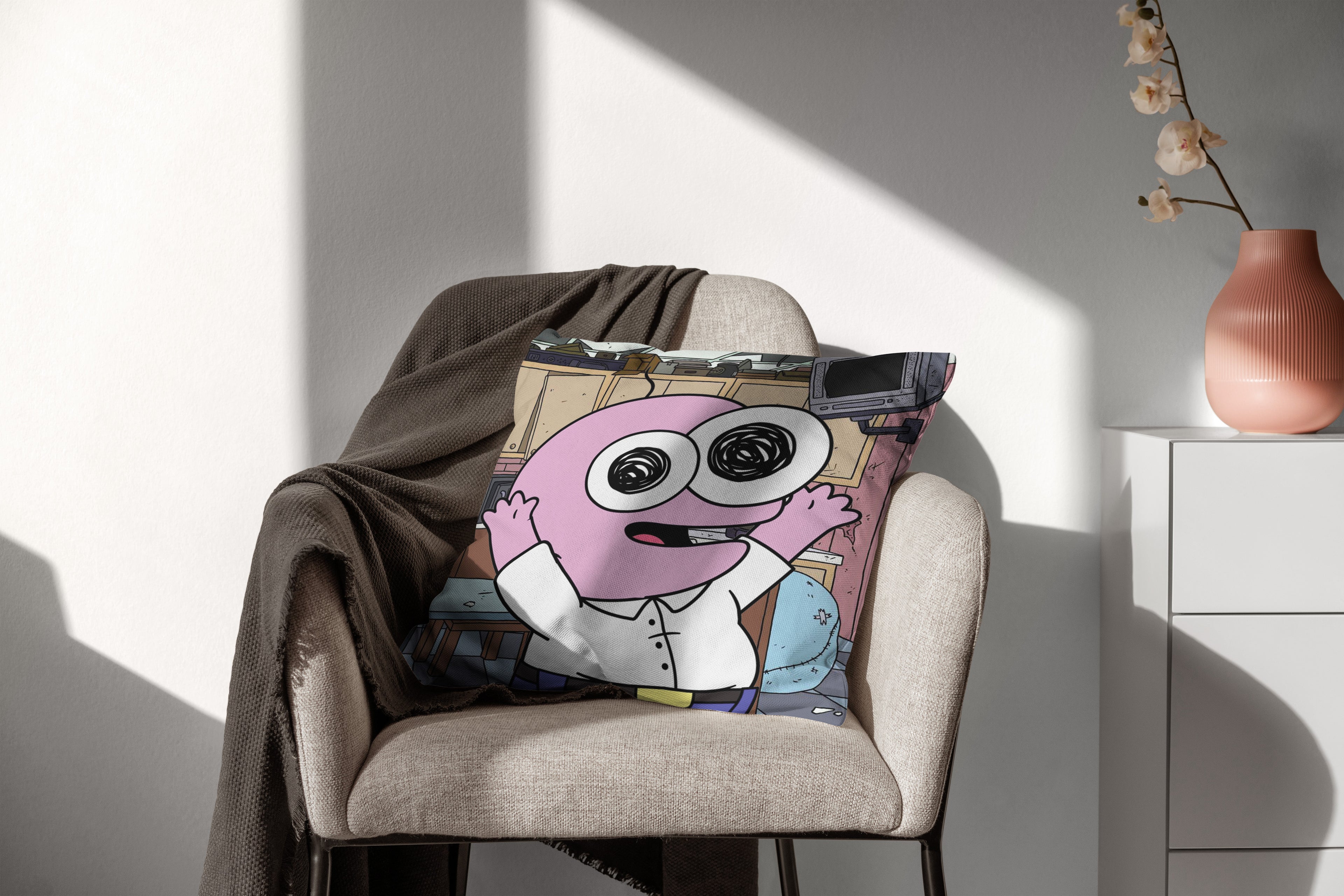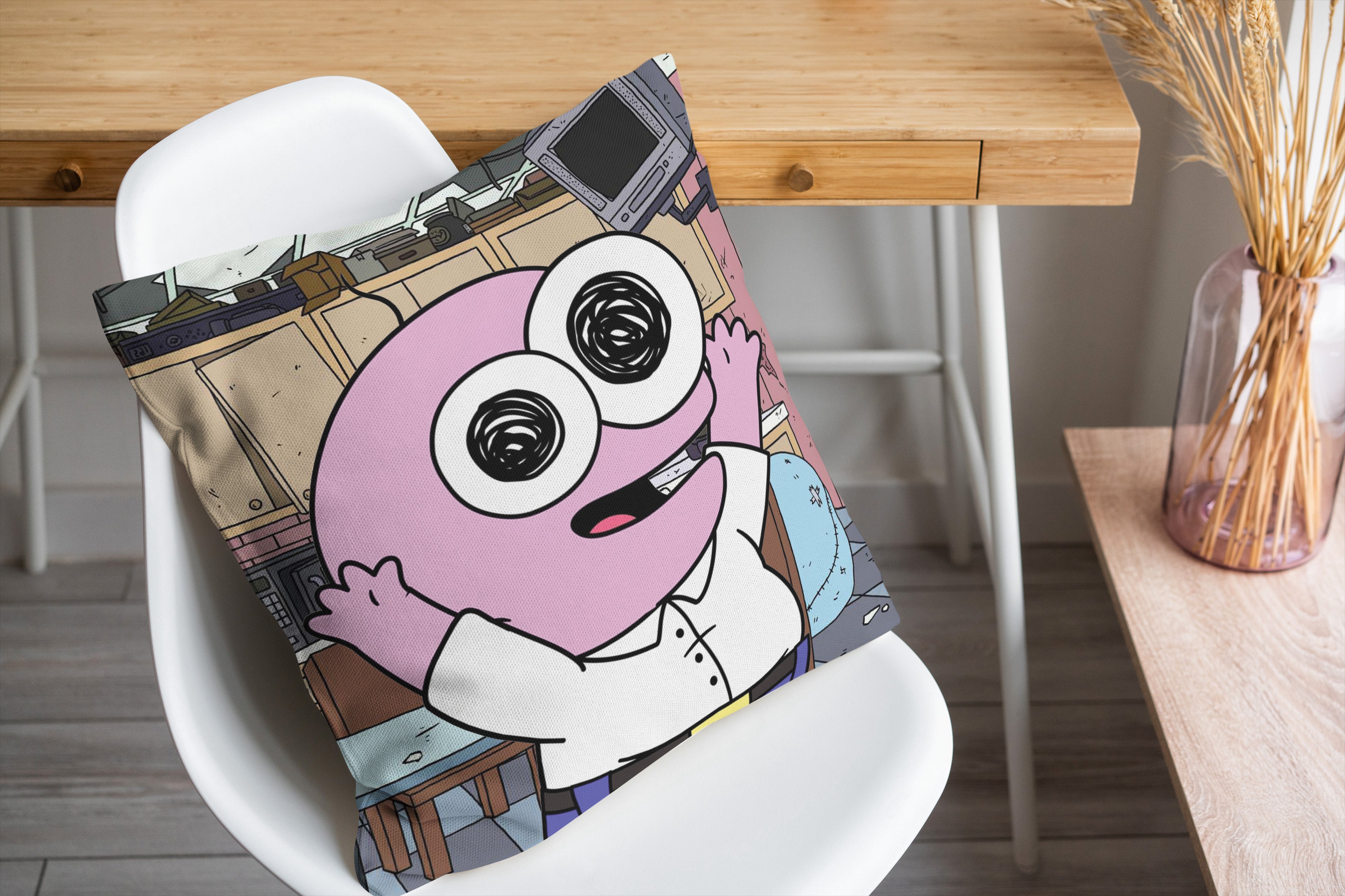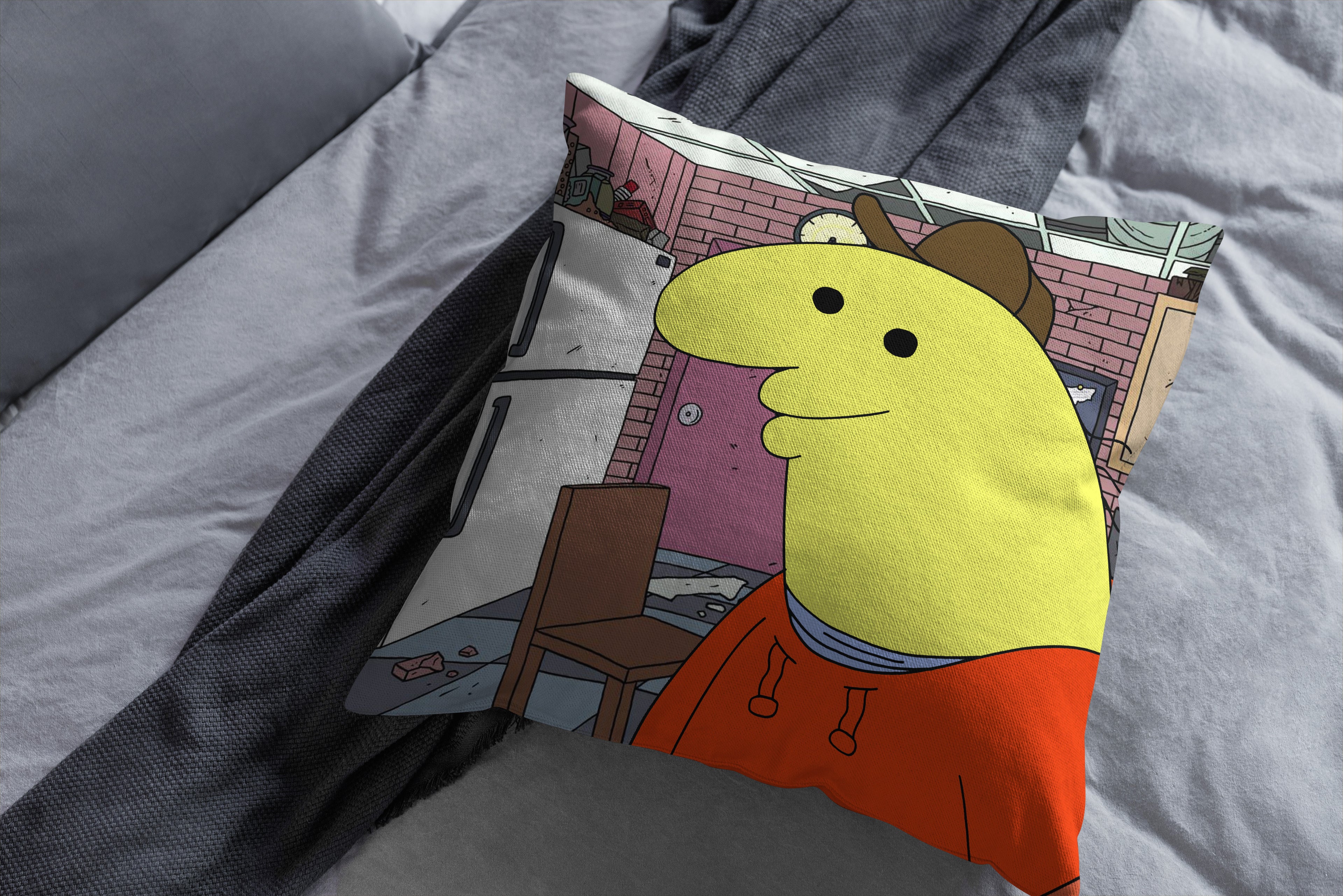 Add some questionable comfort to your space with this reversible Smiling Friends pillow, featuring Pim and Charlie in all their beautifully weird glory! Whether you’re feeling wholesome and chill like Charlie or deranged and spiraling like Pim, just flip the pillow to match your vibe.