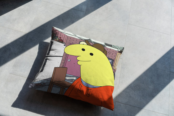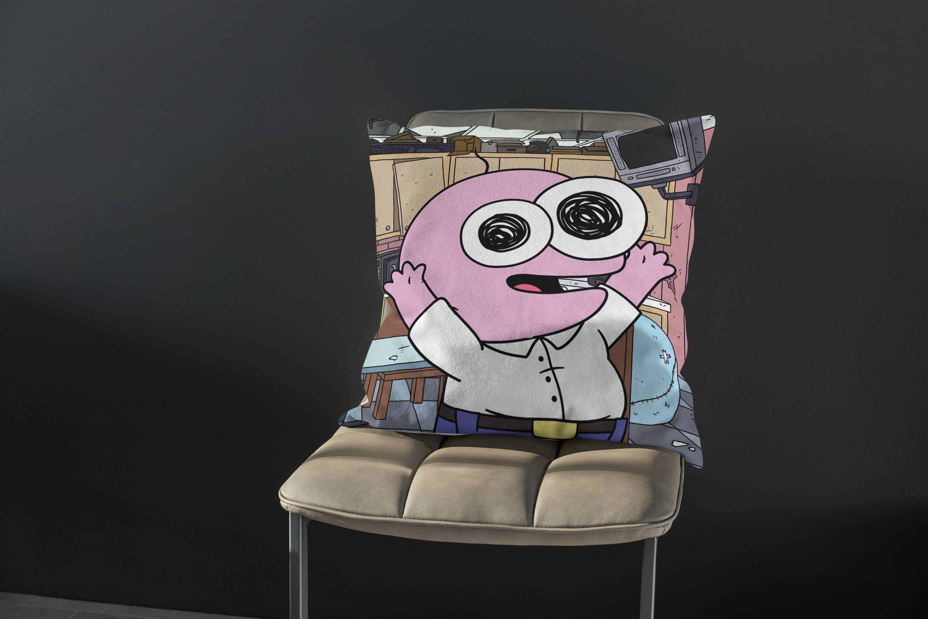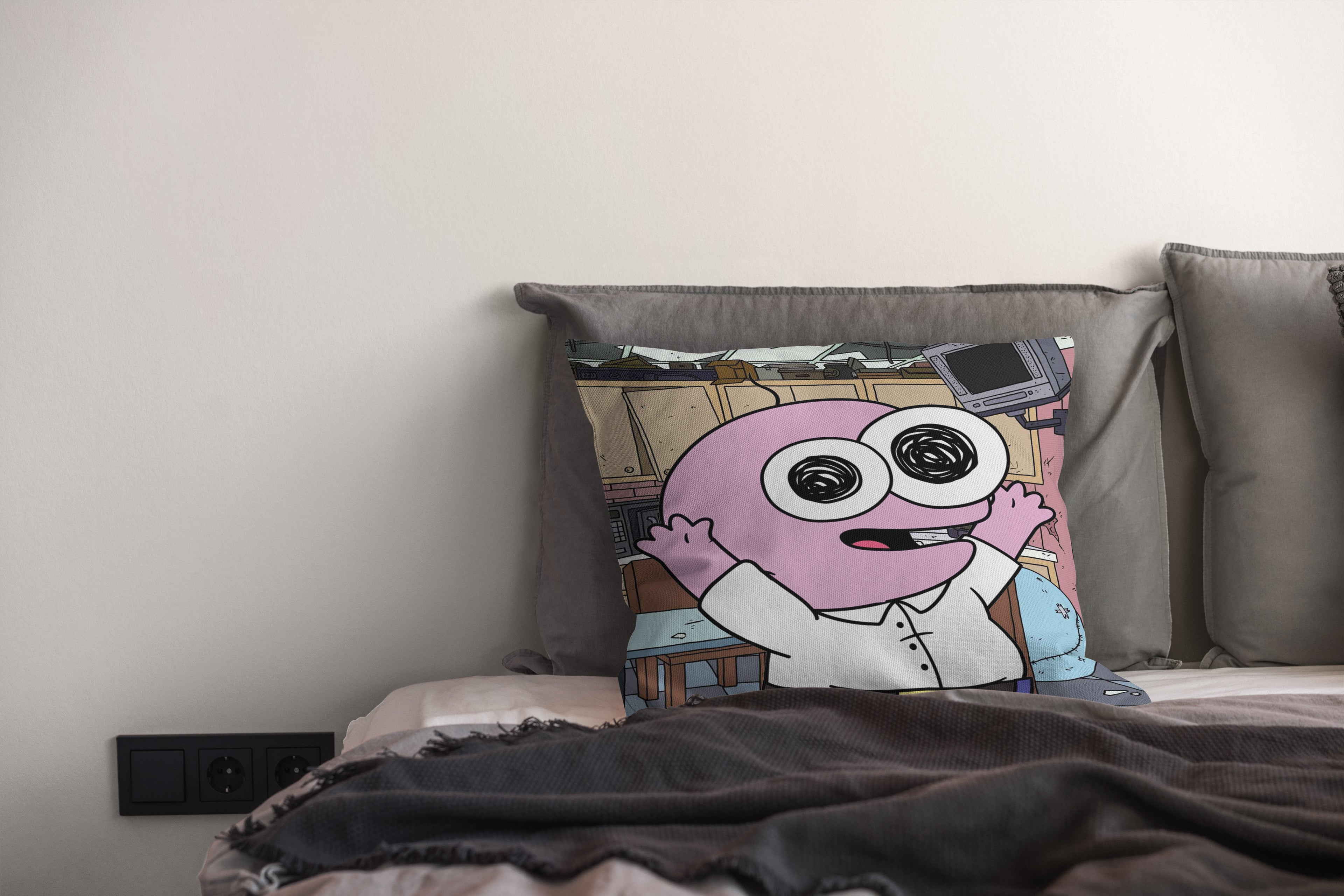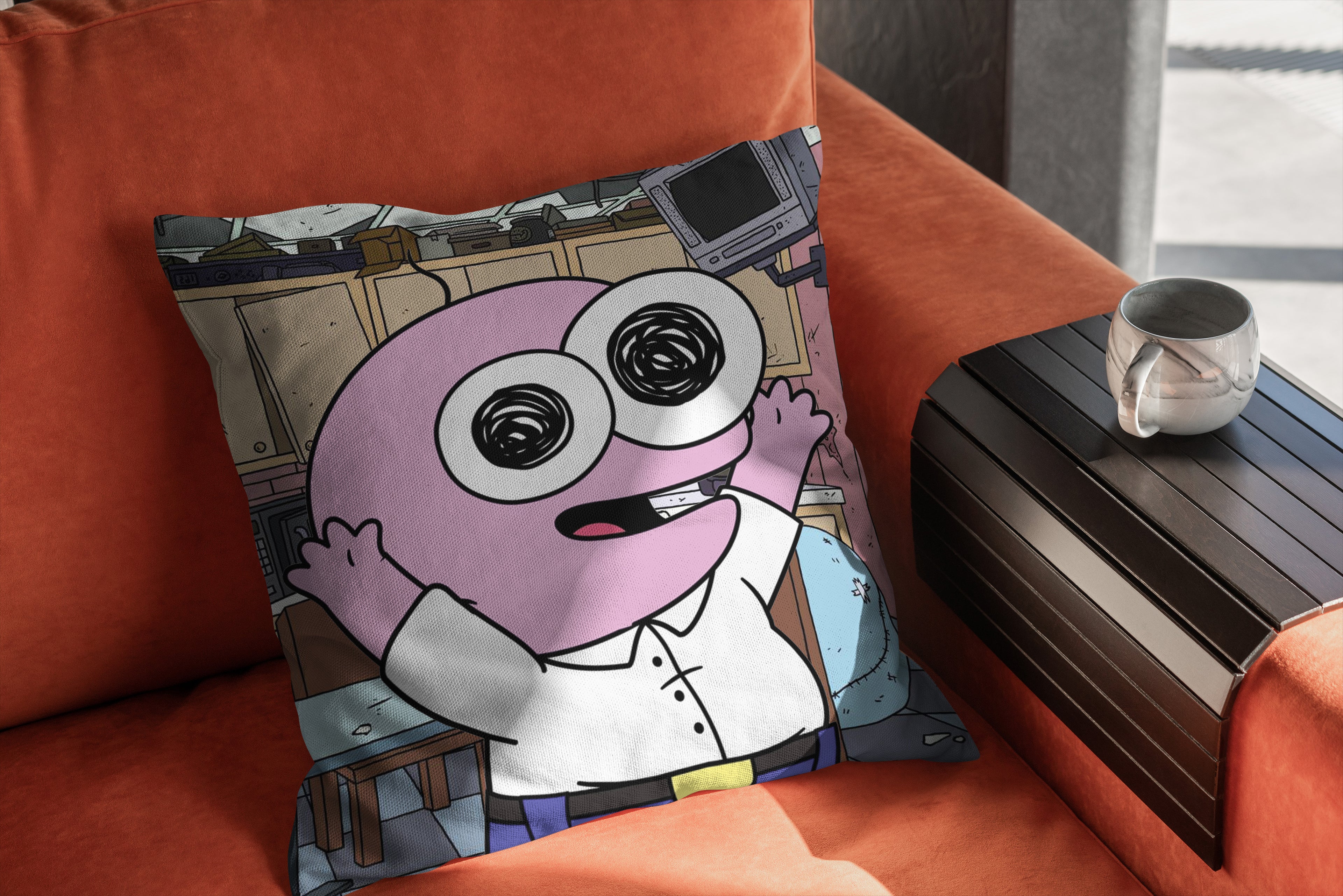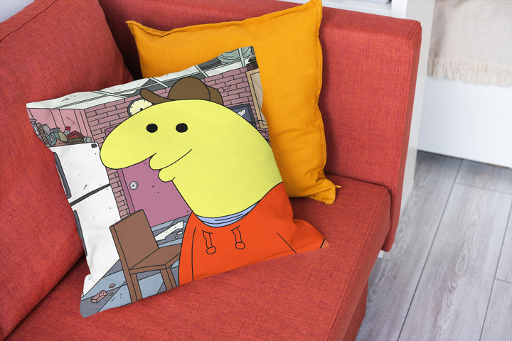 Add some questionable comfort to your space with this reversible Smiling Friends pillow, featuring Pim and Charlie in all their beautifully weird glory! Whether you’re feeling wholesome and chill like Charlie or deranged and spiraling like Pim, just flip the pillow to match your vibe.